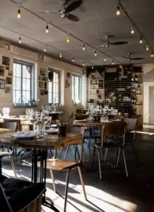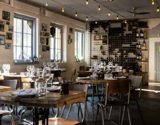 Indretningen er en skøn blanding af vintage elementer og minimalistisk elegance Her finder du træborde, slanke metalstole og vægge med vinflasker, bøger og små detaljer, der skaber en uformel, men alligevel stilfuld oplevelse.