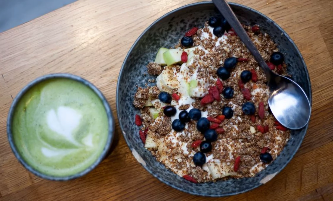 Menukortet begynder ved morgenmadens signatursmoothie­bowls: acai, matcha eller den Instaberømte Blue Bowl, hvor blå spirulina giver cremen en havfrueblå tone, toppet med kokoschips, granola og gojibær, så skålen ligner et lille tropisk diorama.