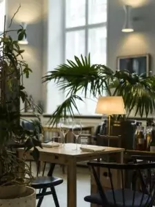 Atmosfæren er afslappet og uformel, hvilket gør det til et ideelt sted for både intime middage og afslappede sammenkomster. Den varme belysning og de nøje udvalgte designelementer bidrager til en følelse af hjemlig komfort, hvor gæsterne kan føle sig godt tilpas.