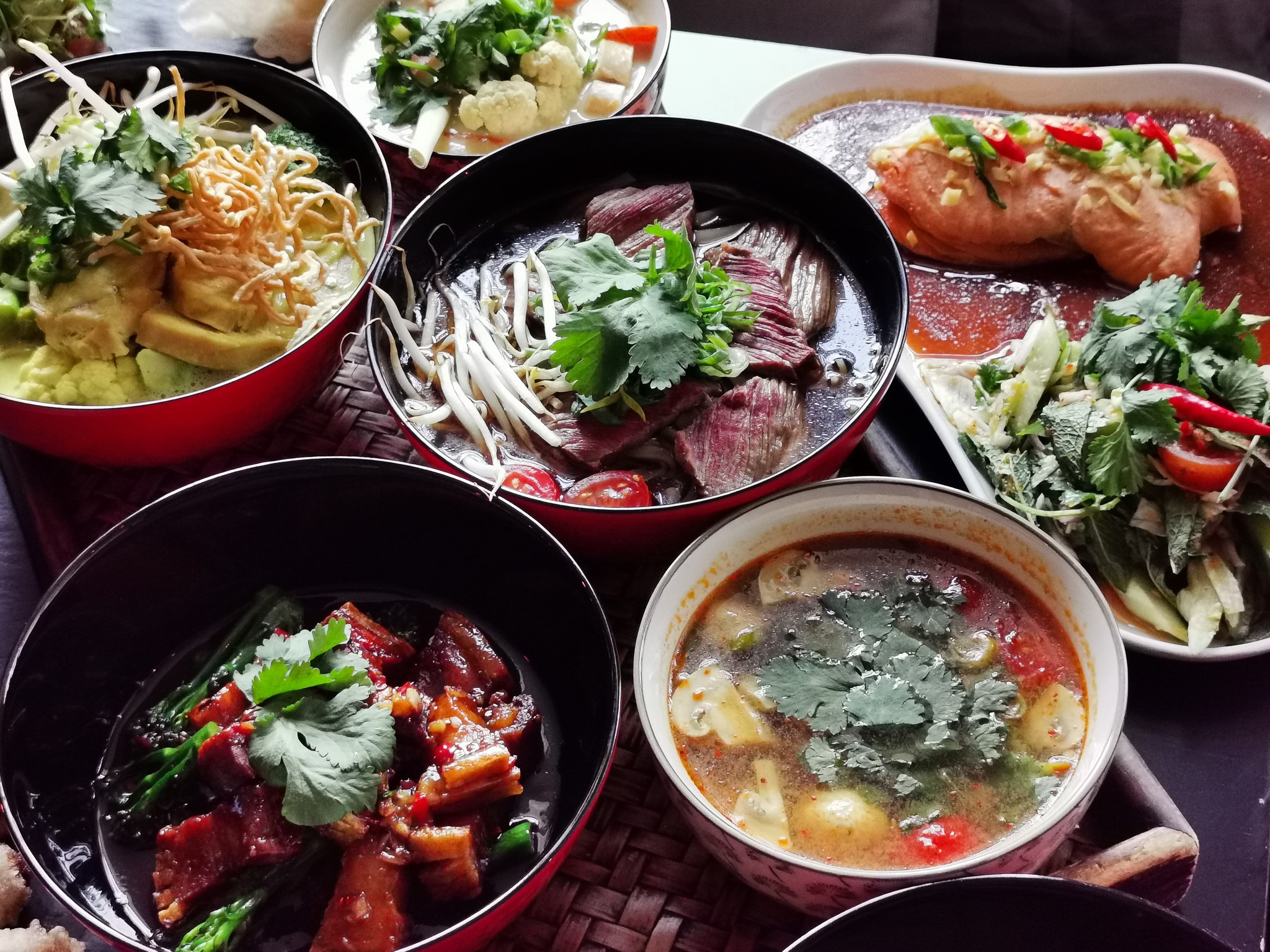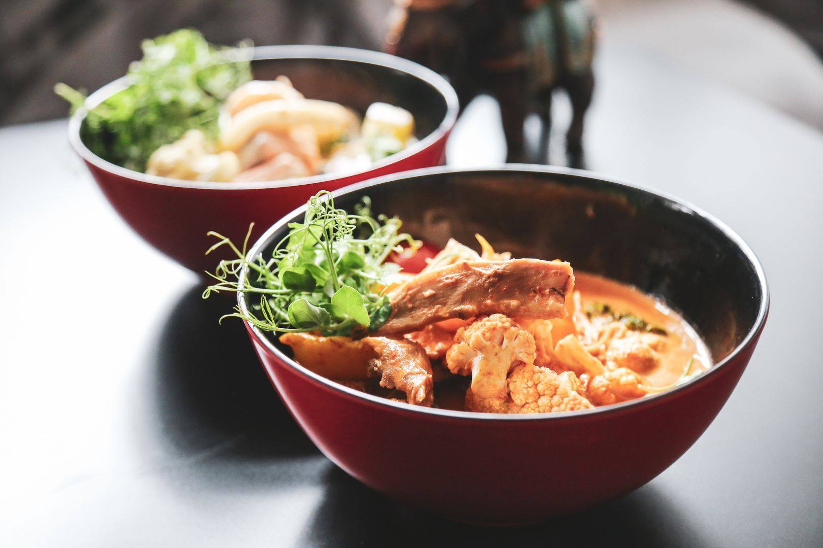 Vegetariske muligheder er også tilgængelige, såsom stegte ris med grøntsager og tofu eller rød kokoskarry med tofu og grøntsager. Til dessert kan gæster nyde sticky rice med sød mango og kokos-is eller luftig passionsfrugtfromage med hjemmelavet vaniljeis.
