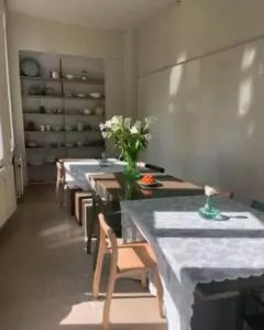 Det rustikke interiør og de bløde, naturlige farver bidrager til en følelse af hjemlig hygge, mens den åbne køkkenløsning giver gæsterne et indblik i madlavningens kunst. Det venlige og opmærksomme personale gør oplevelsen endnu mere behagelig, og den afslappede atmosfære gør det til et ideelt sted for både en uformel frokost og en hyggelig middag med venner eller familie.