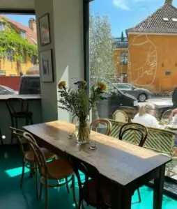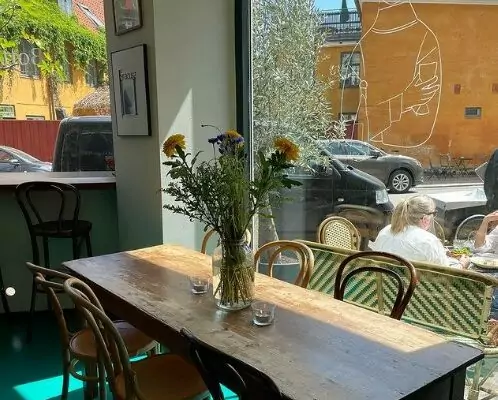 Den lille restaurant er indrettet med varme trætoner, dæmpet belysning og et miks af vintage og moderne, der føles hjemligt og gennemtænkt. Der er en stemning af europæisk storbybistro.