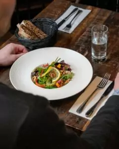 Om aftenen skifter stemningen, og menukortet udvides med retter som grillet oksemørbrad, bagt torsk med sæsonens grønt og risotto med trøffel. Til den søde tand frister desserten med klassikere som chokolademousse og panna cotta.