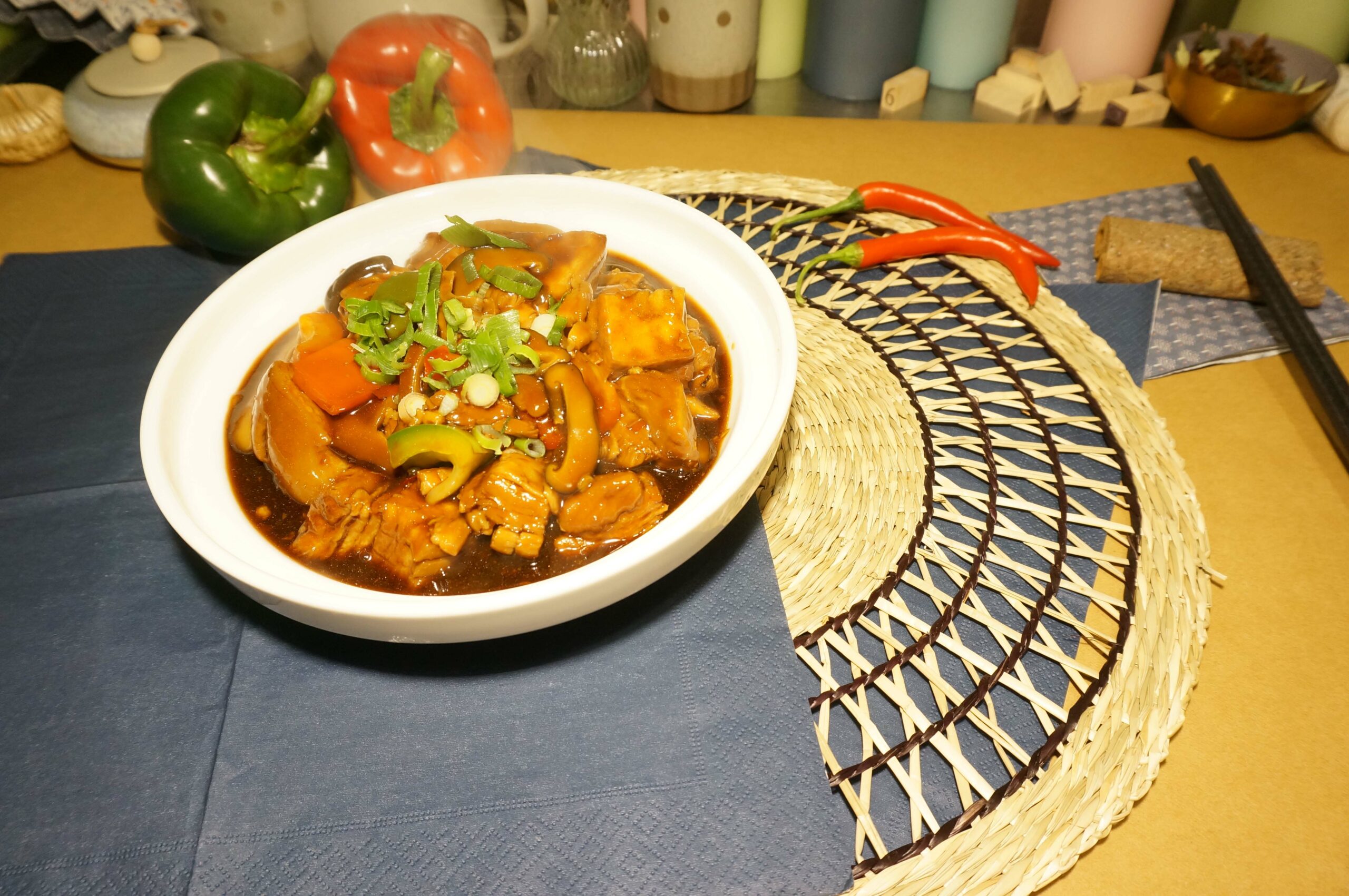 Hovedretterne spænder fra klassiske stegte ris med æg og grøntsager til mere komplekse smagsoplevelser som “Mapo Tofu” – en krydret ret med silketofu og hakket kød i en aromatisk chilisauce. Nudelretterne inkluderer blandt andet “Chow Mein” med sprøde grøntsager og valgfrit kød eller tofu, perfekt krydret og stegt til perfektion.