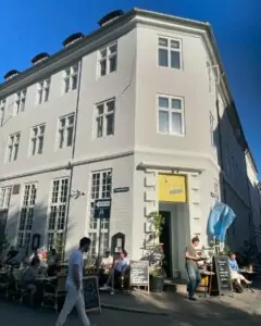 I det åbne lokale mødes du af en behagelig summen, hvor samtaler fra bordene flyder sammen med duften af wok og bouillon. De rå murstensvægge er malet i dæmpede farver, og bløde tekstiler i form af puder og gardiner skaber kontrast til det industrielle udtryk. Store panoramavinduer lukker byens lys ind og giver kig til Vingårdstrædes brostensbelagte gade, mens lamper med varme glødepærer kaster intime lysøer over hver enkelt reol med vinflasker. Bag disken arbejder køkkenpersonalet synkront, og deres bevægelser føles som en rolig danseforestilling, der lader gæsterne følge madlavningens rytme.