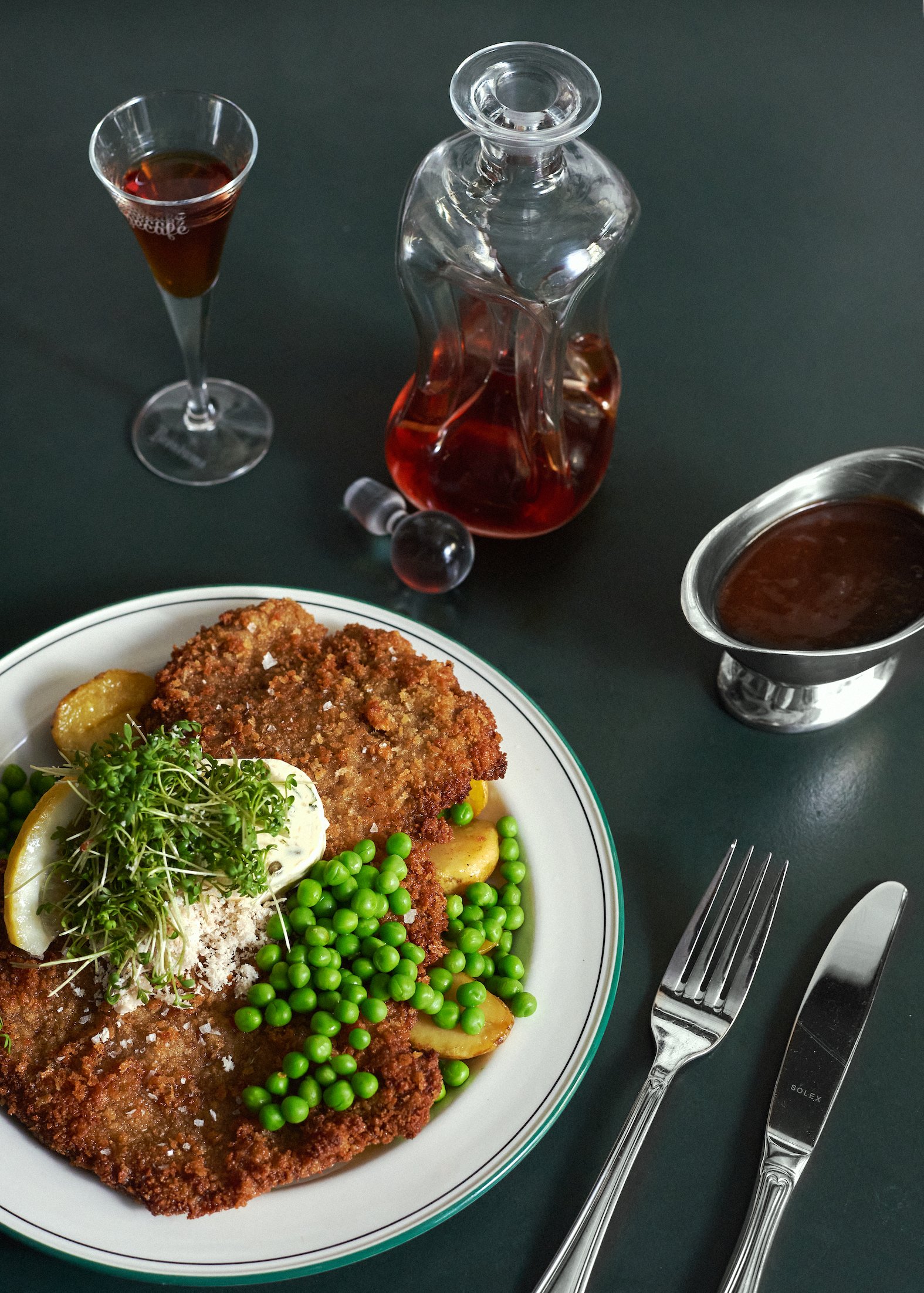 Aftenkortet byder på klassikere som wienerschnitzel af kalv, serveret med ærter, skysauce og pommes sautées, samt “Stegt flæsk med persillesovs”, Danmarks nationalret, der serveres hver onsdag. For vegetarer er der også muligheder som jordskokker tilberedt på forskellige måder og serveret med sauce hollandaise.
