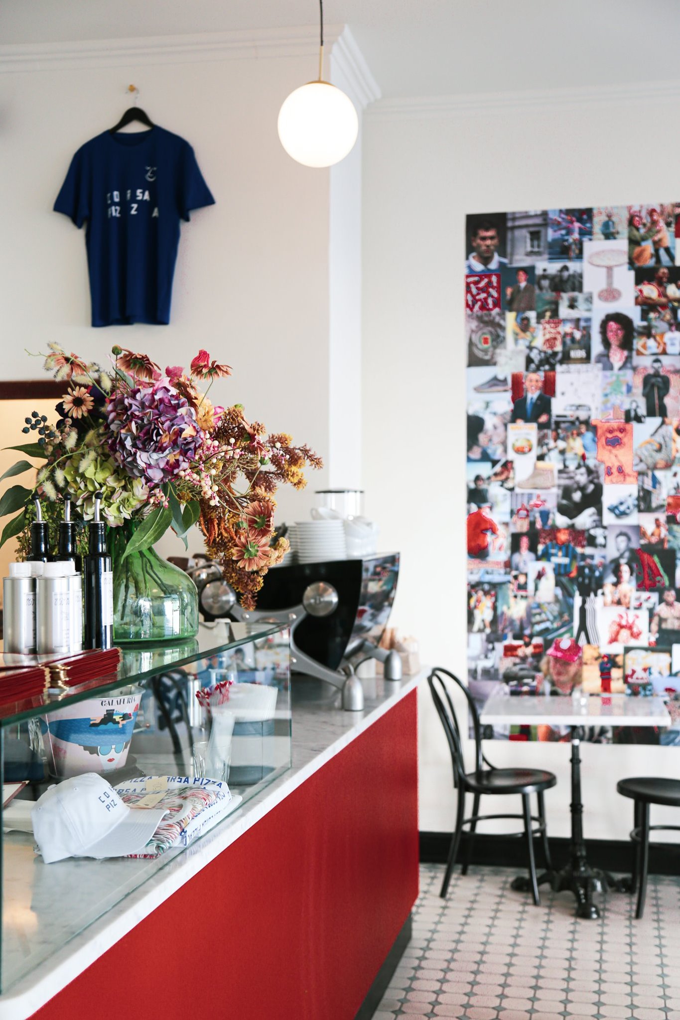 Indretningen er lys og moderne med en åben køkkenløsning, der giver en autentisk oplevelse. Der er både indendørs og udendørs siddepladser, så man kan vælge at nyde sin pizza i solen eller i den komfortable indendørs atmosfære.