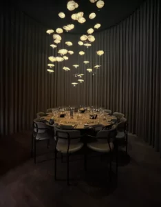 Restauranten er indrettet med fokus på komfort og æstetik. De smagfulde omgivelser skaber en afslappet stemning, hvor gæsterne kan nyde maden og hinandens selskab.
