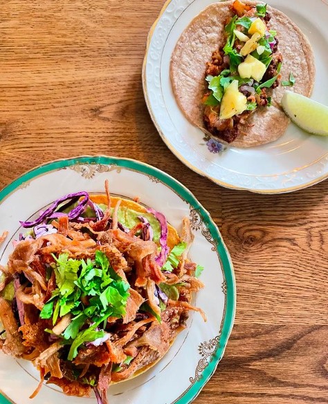 Forretterne inkluderer Esquite, en mexicansk majsret serveret i en kop, og Padron Poppers, fyldte Padron-pebre med flødeost. Hovedretterne byder på Birria Tacos med krydret oksekød og slow-cooked ingredienser. Desserten består for eksempel af Churros, sprøde stænger drysset med kanel og sukker, ledsaget af en karamelliseret mælkedipsauce.