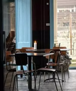 Når du træder ind ad døren til Forglemmigej på Nørre Allé, mærker du straks en særlig tæthed i atmosfæren, som om væggene selv hvisker om årstidernes skiften. De bløde burgundyfarver og ubehandlede træpaneler omfavner dig, mens gulvets grove, keramiske fliser leder blikket mod de små, kunstfærdige keramikfade på hvert bord. Lyset er afdæmpet, men aldrig dunkelt: et par varme glødelamper hænger lavt og fremhæver naturens ujævnheder i bordpladerne og de fine åreringe i den genbrugte eg.