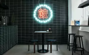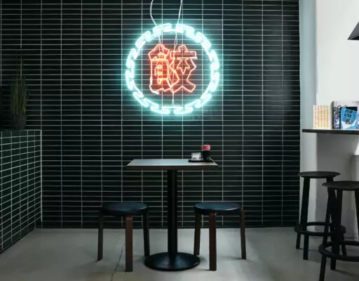 Væggene er prydet med keramiske fliser og farverige plakater hæftet op med gaffatape, hvilket skaber en uformel og indbydende atmosfære. Et fremtrædende neon-lyssignal formet som en dumpling tilføjer et moderne touch og understreger stedets unikke karakter.