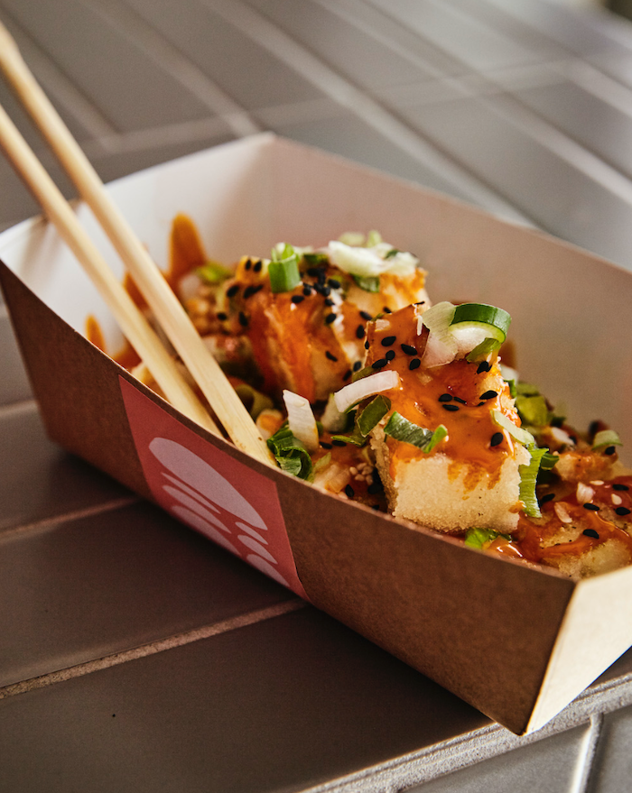 Varme retter som dobbeltstegt tofu med chilimayo og nudler i spicy peanutsauce med kål, gulerødder, agurk og knuste peanuts giver yderligere dybde til menuen.