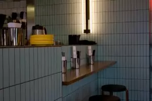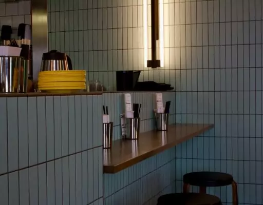 Interiøret kombinerer skandinavisk enkelhed med asiatiske elementer. De grønne keramiske vægge og de farverige plakater, der er fastgjort med gaffatape, skaber en livlig og autentisk stemning. Neonskilte, herunder et formet som en dumpling, tilføjer et moderne præg og bidrager til den unikke atmosfære.