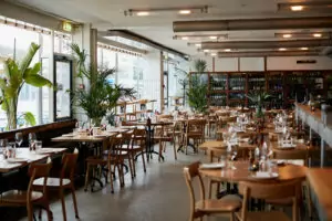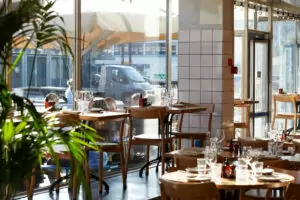 Lokalet er stort, højtloftet og spækket med rå detaljer – tænk: Synlige rør, massive betongulve, vintage lamper og lange træborde. Det lyder måske lidt hårdt, men det hele bliver balanceret af varme toner og levende lys.