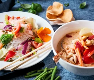 Menuen spænder bredt fra klassikere som Pad Thai og Tom Yum-suppe til aromatiske karryretter og friskstegte wokretter med sprøde grøntsager og mørt kød eller tofu. Der er også grillet blæksprutte eller papayasalat med fiskesauce og chili.