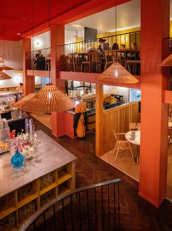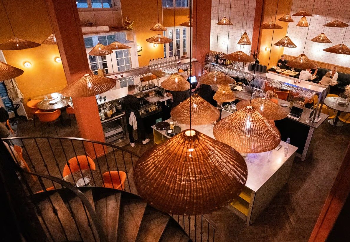 Indretningen er en harmonisk blanding af farverige asiatiske elementer og nordisk design. Orange vægge, autentiske fletlamper og gule stole tilfører varme og liv til rummet, mens mørkt sildebensparket og designermøbler understreger den skandinaviske æstetik. Store vinduespartier lader naturligt lys strømme ind.