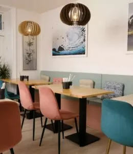 Indretningen kombinerer moderne elementer med vietnamesiske detaljer, hvilket skaber en autentisk oplevelse. Det er et sted, hvor man føler sig velkommen, uanset om man er der for en hurtig frokost eller en længere middag.