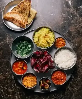 Hos Juma på Ryesgade bliver middagen centralt organiseret omkring thalioplevelsen, hvor alle gæster starter med en bakke fyldt med ti små retter. Retterne varierer fra milde, cremede kormacurries og syrlige tamarindchutneys til friskbagte naanstrimler, der indbyder til at dyppe i de fyldige saucer. Hver skål på thali’en er lavet med omhu for både krydderibalance og konsistens, så man oplever alt fra silkeblød paneer i tomatsauce til let sprøde papadums. I kernen af konceptet ligger en plantebaseret tilgang, men der er også mulighed for at tilføje kødretter som saftige lammekoteletter marineret i varme garam masalaer og en intens pork cheek vindaloo, hvis man ønsker et mere markant krydderiudtryk.