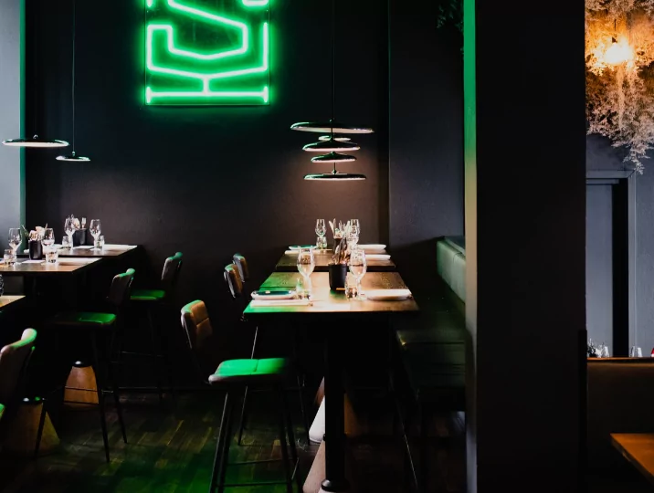 Indretningen er moderne med varme toner, masser af træ og tekstil, bløde lys og dæmpet farvepalet. Der er plads til grin, samtaler og toast-glimtende middage, men også til mere intime aftener i hjørnebordene med dæmpet belysning og små glas.