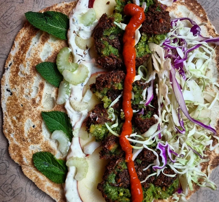 Lammekødet har ligget i marinade natten over, før det ryger på grillen og pakkes ind i et luftigt surdejsfladbrød, som varmes op direkte på jernpladen. Derudover er de friskkrydrede falafler fyldt med masser af smag.