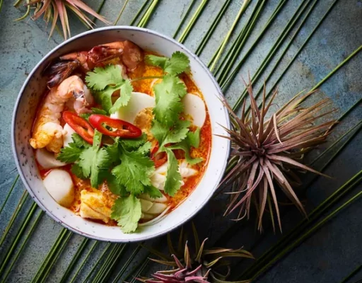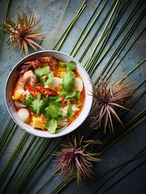 Forretterne inkluderer Kerupuk Udang, rejechips med krydret Lao Gan Ma mayo, og Tuna Gohu, tun med basilikummayo og jordnødder. Hovedretterne spænder fra Sate Kambing, lammesatay i sød sojasauce med Sambal Kecap, til Siomay Goreng, kylling eller grøntsagsboller med jordnøddesauce.