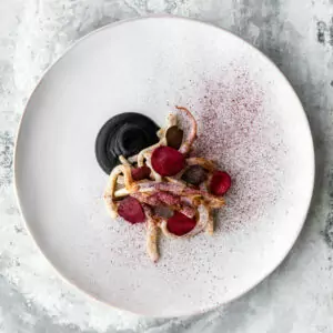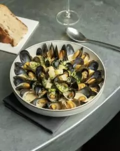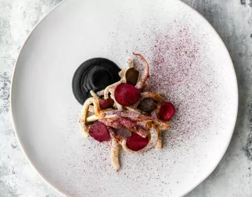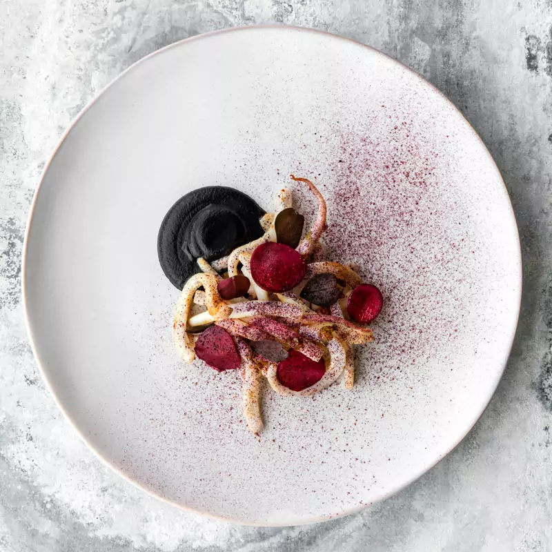 Ud over østers byder menuen på retter som dampede blåmuslinger fra Limfjorden, tilberedt med æblecider og urter, hvilket giver en delikat balance mellem sødme og friskhed. En anden bemærkelsesværdig ret er den tyndtskårne blæksprutte serveret i en aromatisk kyllingedashi, hvor blækspruttens møre tekstur komplementeres af den dybe umamismag fra bouillonen.