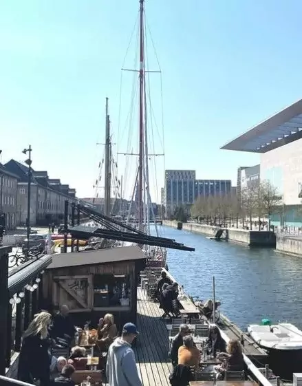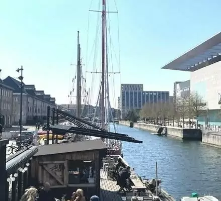 Forestil dig at træde ombord på en gammel færge, hvor du bliver mødt af duften af frisklavet mad, lyden af bølger mod skroget og en udsigt over Københavns Operahus og den glitrende havn.