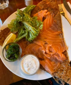 Udover galettes byder menuen på klassiske franske specialiteter som løgsuppe og croque monsieur, der tilfredsstiller enhver frankofil.