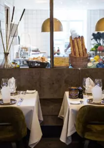 Gæsterne spænder bredt, fra familier og vennepar til forretningsfolk og stamgæster, der tydeligvis har deres faste hjørnebord. Men uanset selskabets karakter, falder de fleste ind i den samme rytme. Man taler lidt lavere, man smager lidt langsommere, man bliver siddende lidt længere. Det skyldes både rummets akustik, der er behagelig afdæmpet, og personalets tilgang, som balancerer mellem det imødekommende og det diskrete. Tjenerne er opmærksomme uden at være opsøgende, og der bliver aldrig trukket opmærksomhed væk fra det, der foregår ved bordet.