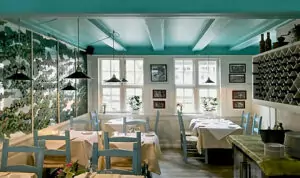 I de kolde måneder bidrager en stor pejs til en hyggelig atmosfære, mens den rummelige gårdhave tilbyder mulighed for romantiske middage under åben himmel i sommermånederne.