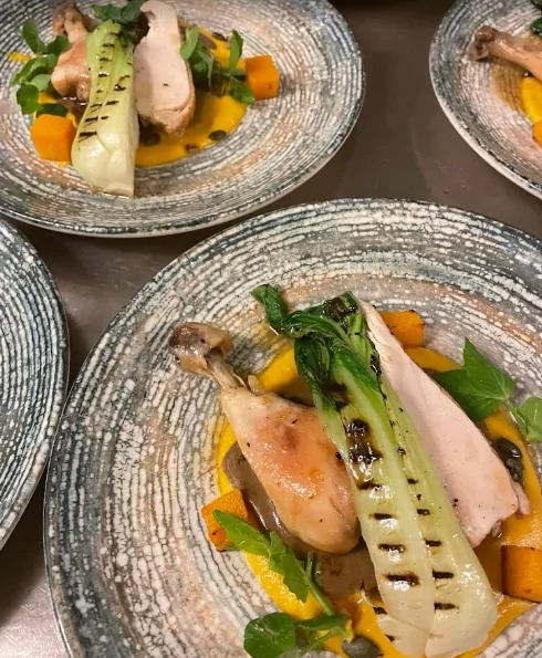 Til hovedret kan man nyde retter som mørt kalvekød serveret med en intens trøffelsauce, klassisk høne i gryde med en let og aromatisk consommé eller laks tilberedt med en frisk havesyresauce.