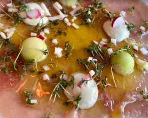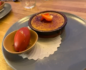 Afslutningsvis kan gæsterne nyde desserter som crème brûlée med hindbærsorbet eller profiteroles med hjemmelavet vaniljeis og chokoladesauce.
