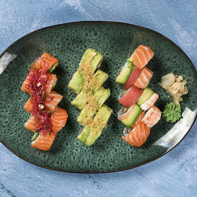 Menuen spænder bredt – fra nigiri og maki med laks og tun til friterede rejer, små sticks med kylling og grillede grøntsager. Fisken er frisk, risen har et blødt bid, og de varme retter er ofte lidt af et højdepunkt, især de grillede yakitori-sticks og tempuraretterne.