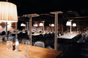 De åbne rum, det industrielle interiør og det bløde lys skaber en hyggelig kontrast, der gør det nemt at falde til ro – uanset om du er på date, spiser middag med vennerne eller fejrer noget særligt.