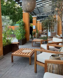 De store vinduespartier lader dagslyset strømme ind og giver gæsterne mulighed for at nyde udsigten til haven. Om aftenen oplyses terrassen af ildsteder, hvilket skaber en varm og indbydende atmosfære for dem, der ønsker at nyde måltidet under åben himmel.