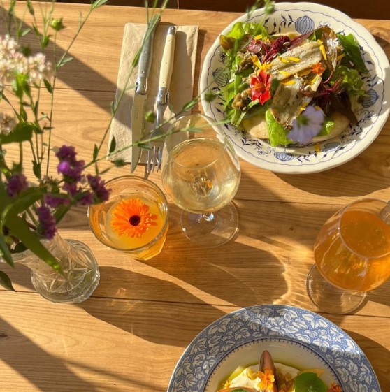 I hjertet af haven ligger en indbydende restaurant, hvor man kan nyde sæsonbestemte retter lavet med ingredienser fra den egen gård og lokale økologiske producenter. Interiøret består af smukke telte, der skaber en hyggelig og unik atmosfære, perfekt til både afslapning og samvær.