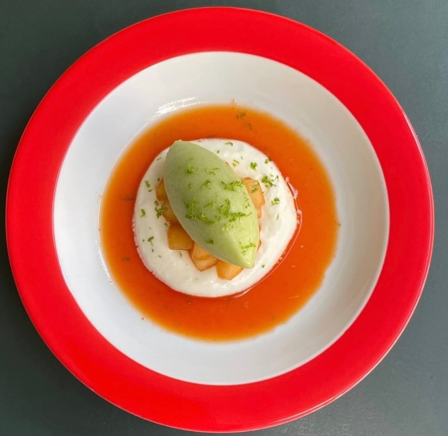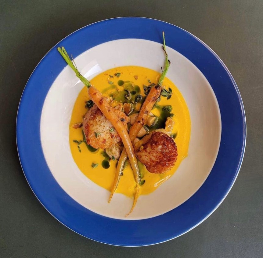 A la carte-menuen byder på spændende kombinationer som stracciatella med bagte druer og salvie, artiskok med linser og baba ganoush samt hamachi med ponzu, pære og ingefær.