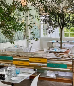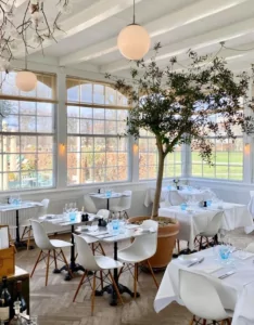 Restauranten tilbyder en atmosfære præget af historisk charme og moderne komfort. Indretningen er lys og indbydende med store vinduer, der giver et naturligt lysindfald og en smuk udsigt over haven. De hvide vægge og lofter, kombineret med klassiske møbler og grønne planter, skaber en elegant og afslappet stemning.