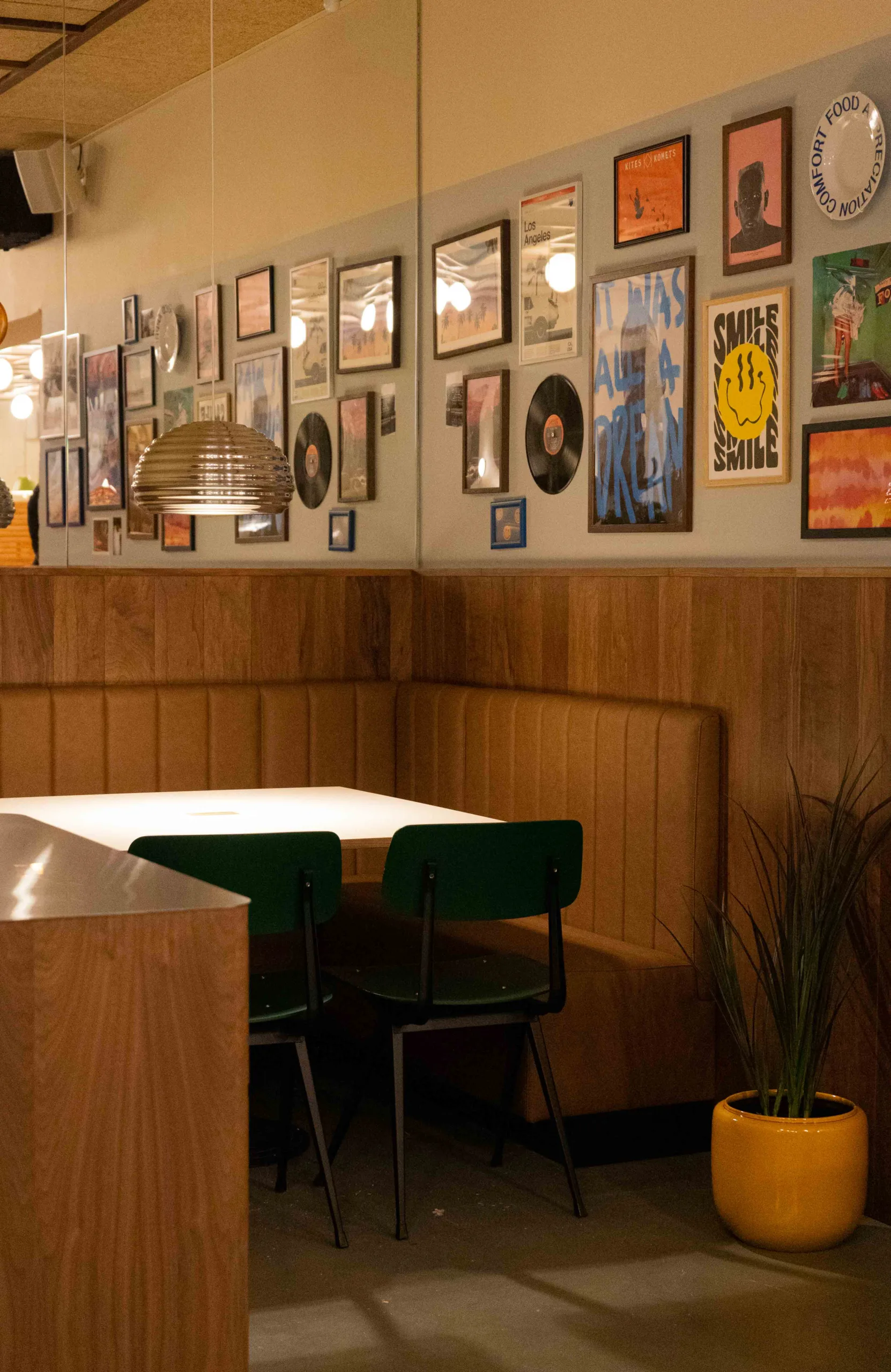 Når du træder ind i Palazzo Diner, bliver du mødt af en indbydende og livlig atmosfære. Indretningen er en smuk blanding af varme læderbænke, farverige stole og vægge dekoreret med LP-plader, gamle plakater og kunstværker. Denne unikke indretning skaber en følelse af at være et sted, hvor alle er velkomne, og hvor hver detalje er omhyggeligt udvalgt for at bidrage til den samlede oplevelse.