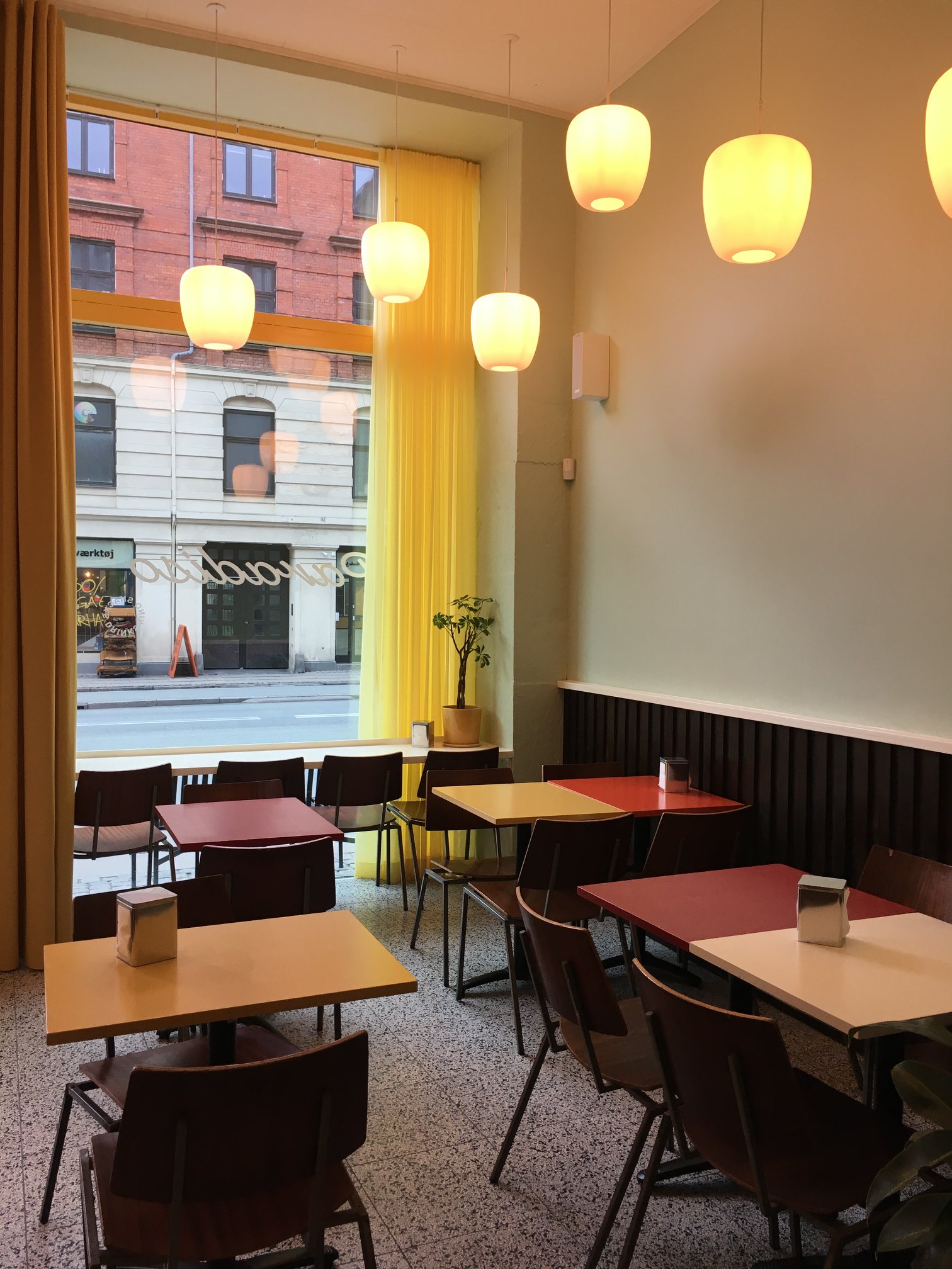 Interiøret er lyst og åbent med højt til loftet, hvilket skaber en rummelig følelse. De gule gardiner tilfører varme og farve til rummet, mens terrazzo-gulvet giver et moderne touch. En markant vinvæg fyldt med et imponerende udvalg af flasker tiltrækker opmærksomhed og understreger barens fokus på kvalitetsvine.
