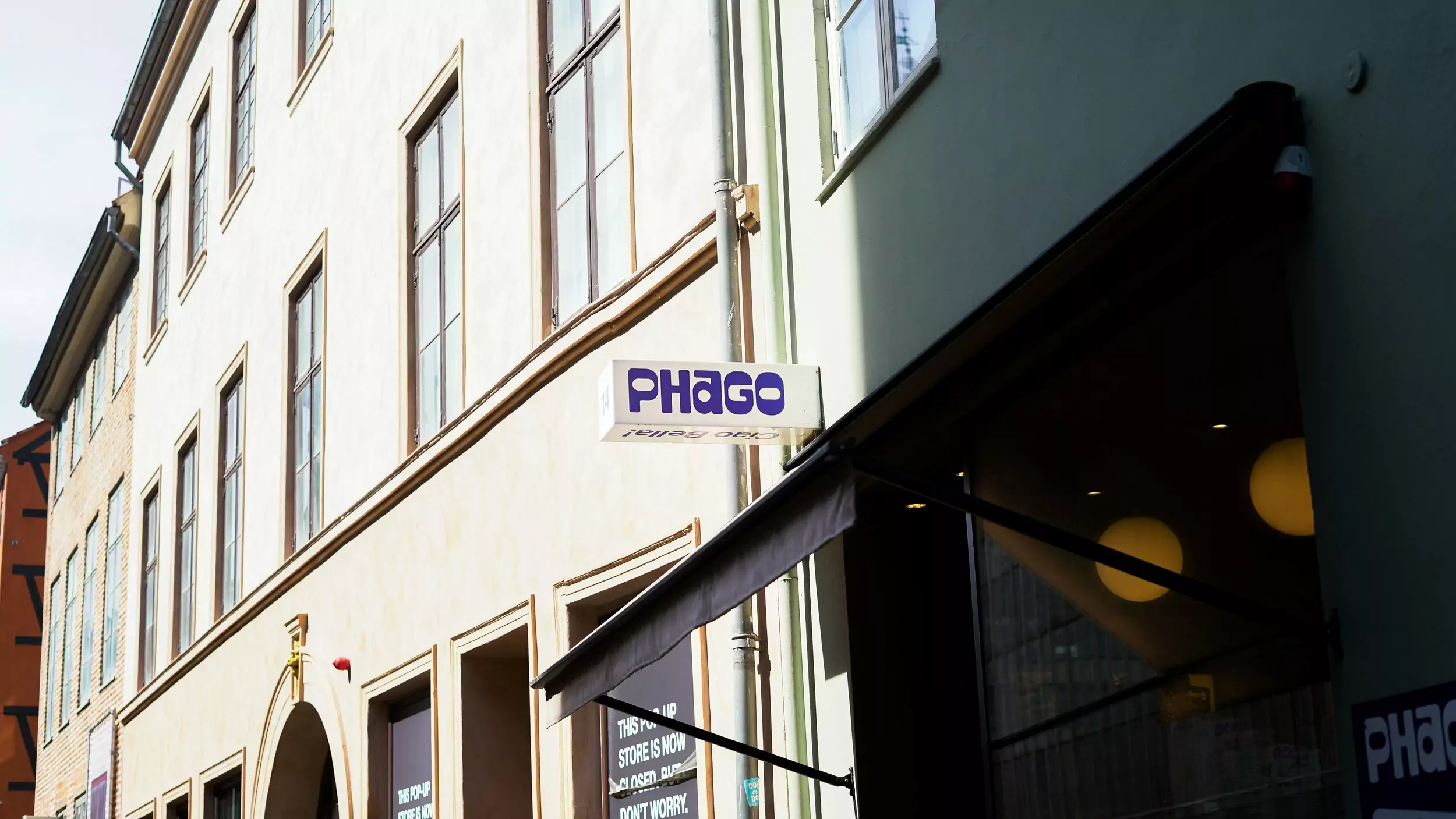 Ved Broens Gadekøkken folder Phagos atmosfære sig ud i samspillet mellem byens rå kajkant og de lyse farvetoner fra madboderne. Belysningen er enkel: hvide guirlandelys strækker sig fra boderne til træbænkene og skaber en let spejling i kanalens rolige vand. Om dagen kastes solens stråler ubesværet gennem de åbne facader, mens skyggerne fra både og de gamle pakhuse langs Strandgade danser hen over fladbrødene i kundens hænder. Når aftenen tager over, tændes lanterner med et blødt, gyldent skær, der får de farverige wraps og salater til at fremstå som små lyskunstværker på de fælles langborde.