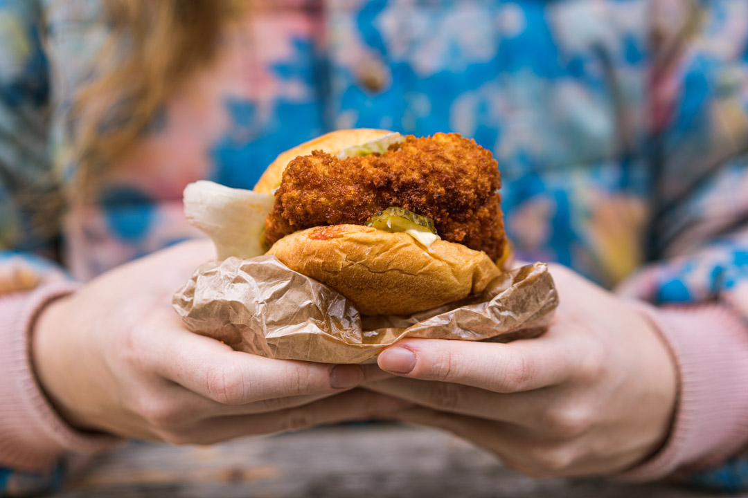 Du kan enten få den sprøde fried chicken sandwich eller en vegetarisk fried mapo tofu sandwich. Begge serveres i en blød briochebolle med syltede agurker, mayo, ost og salat.