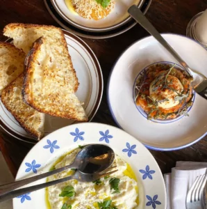 Gæster kan vælge mellem snacks som hummus med sprøde kikærter og chili romesco, eller lynstegt tun med soya/lime, avocado, sesam og koriander. Hovedretterne spænder fra vegetariske retter som ratatouille med beluga linser og sæsonens grøntsager, til kødretter som grillet lammekrone med grillet citron og oksemørbrad fra Uruguay.