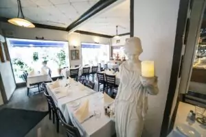 Indretningen er enkel og traditionel, med hvide vægge og blå detaljer, der minder om de klassiske farver fra de græske øer. Belysningen er dæmpet, hvilket skaber en intim og hyggelig atmosfære, ideel til både romantiske middage og sammenkomster med venner og familie.