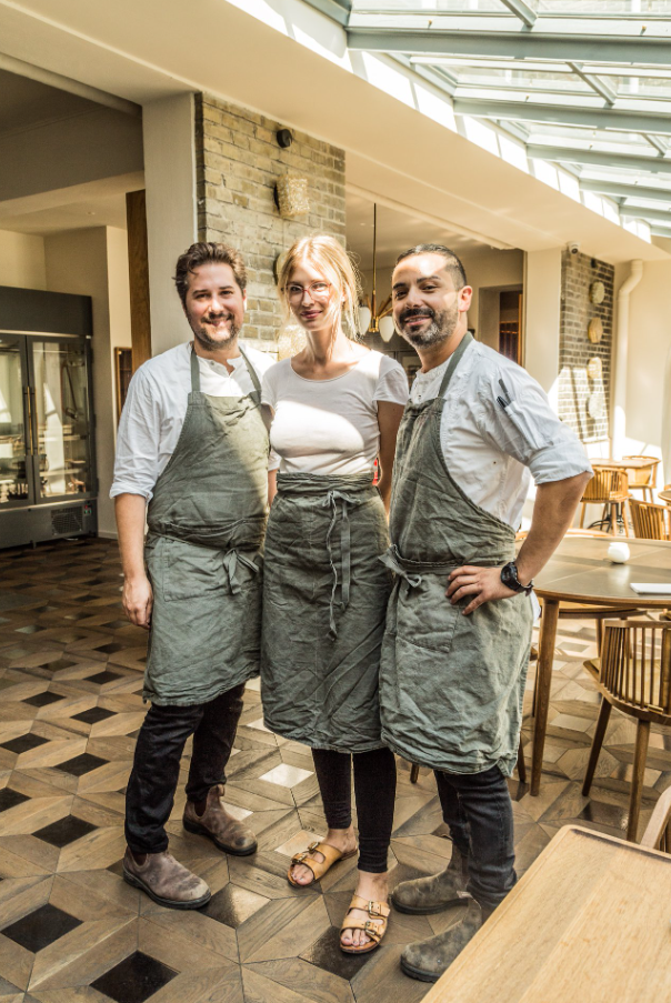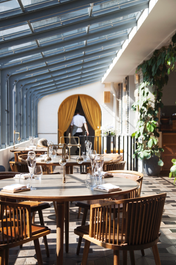 Et særligt træk ved restauranten er “glashuset”, inspireret af Manhattan Bridge, som bringer et urbant præg og fylder rummet med naturligt dagslys. Gulvet, et samarbejde med Made a Mano, består af en blanding af lavasten og eg, hvilket tilføjer en raffineret elegance til indretningen.