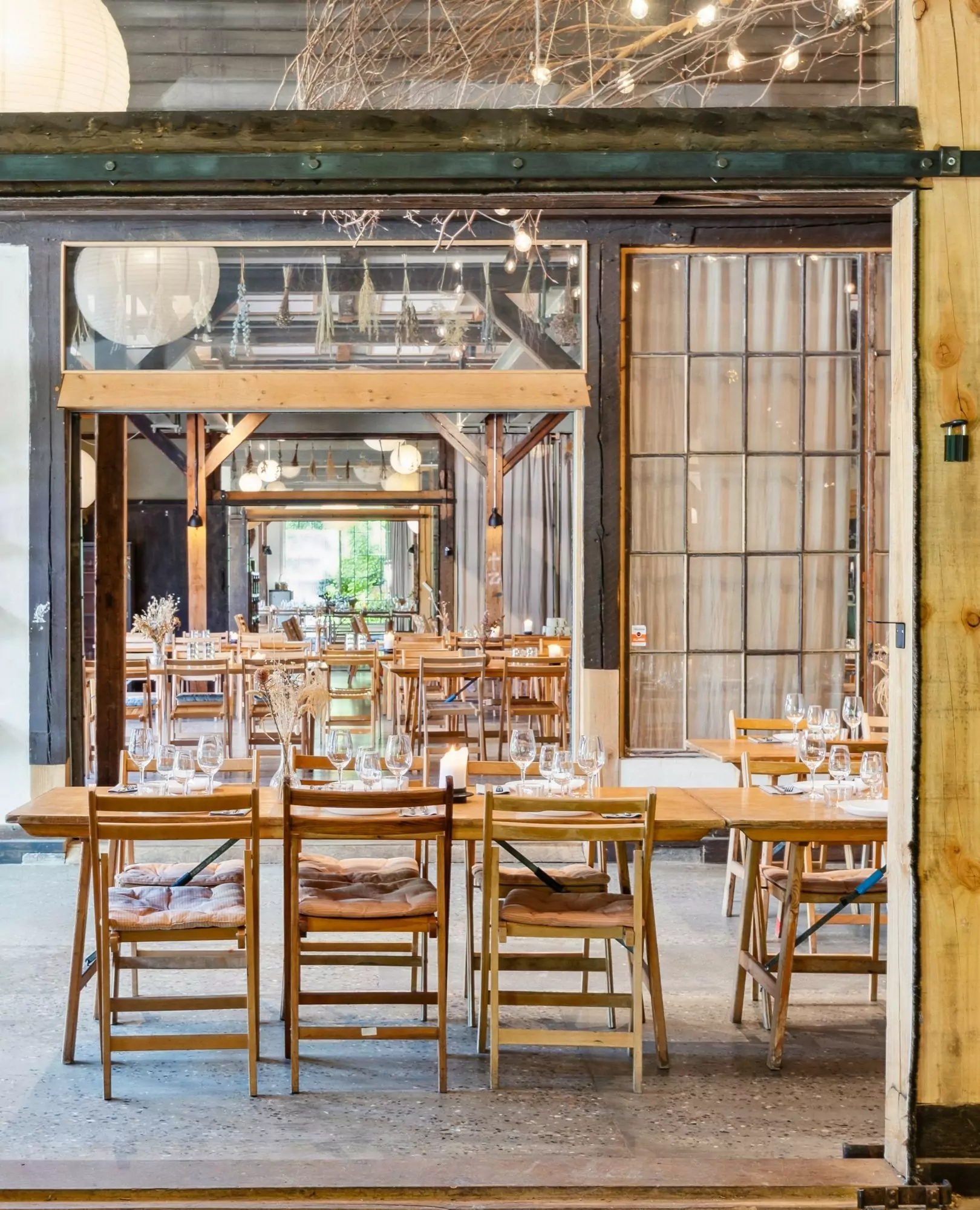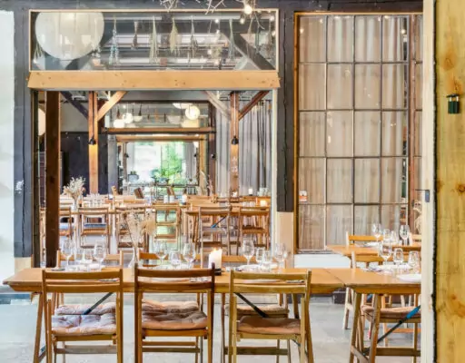 Indretningen er en hyldest til genbrug og håndværk, hvor rå træbjælker og naturlige materialer skaber en rustik, men indbydende stemning. Hver en krog fortæller en historie om fortidens industri og nutidens grønne omstilling. Her er plads til både intime middage og livlige sammenkomster, hvor maden nydes i takt med naturens rytme.