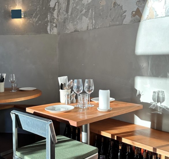 Restaurant Cleo på Nørrebro byder på en afslappet og indbydende atmosfære. Indretningen kombinerer rå og moderne elementer med varme træborde, røde betongulve og stålstole. Dette skaber et stilfuldt og samtidig uformelt miljø, hvor gæsterne føler sig velkomne.
