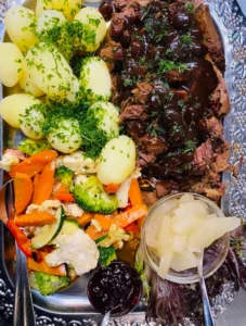 Til aften kan gæsterne nyde klassikere som hakkebøf med bløde løg og spejlæg, frikadeller med rødkål og stegt flæsk ad libitum med sprøde svær og persillesovs.