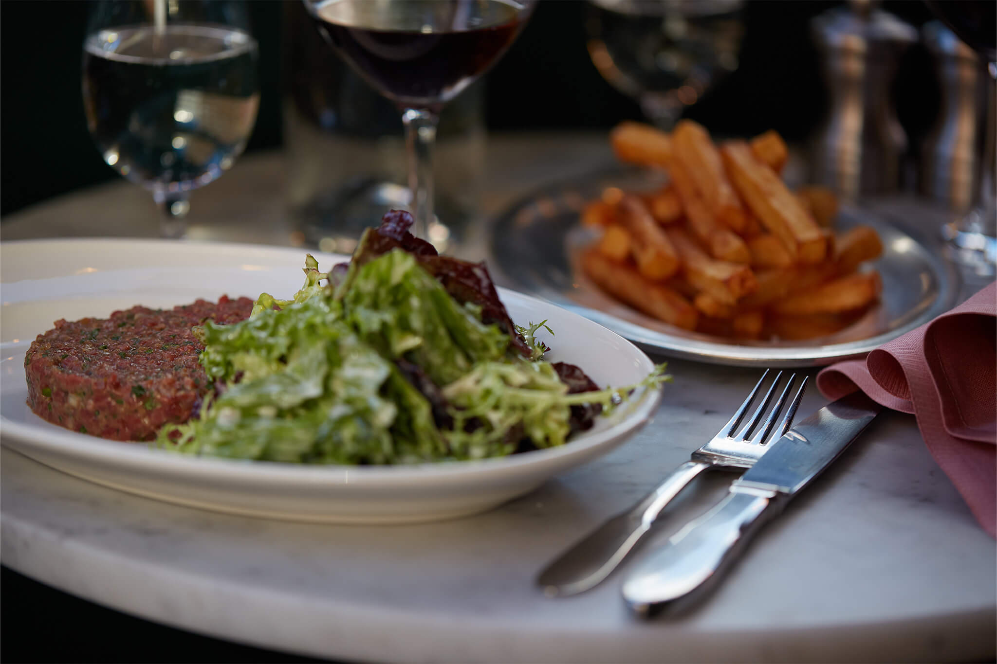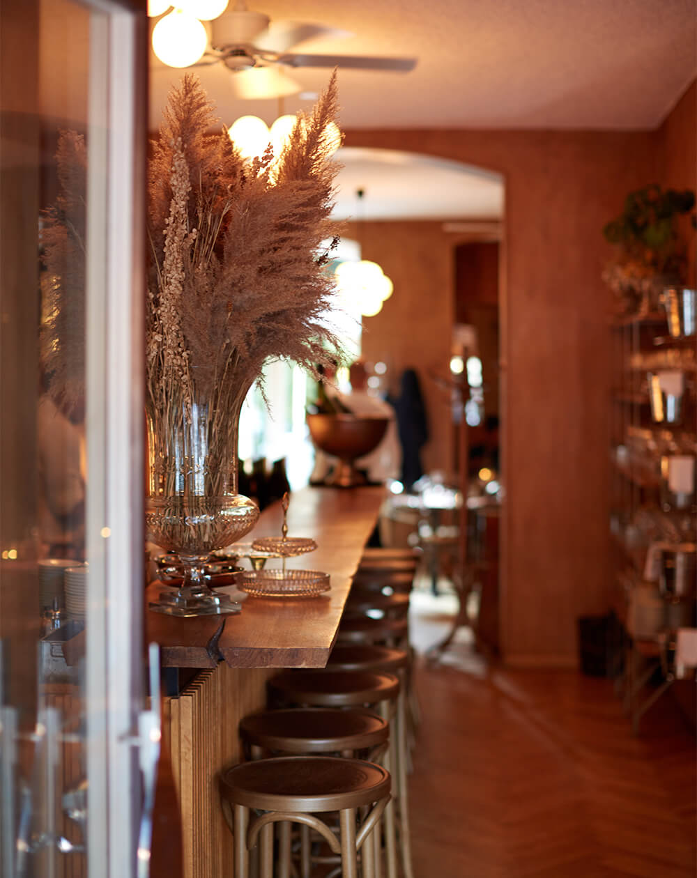 Indretningen er gennemført. Træpaneler, dæmpet belysning, tekstiler i varme farver og små detaljer – som håndskrevne vinanbefalinger på væggen eller et lille glas med saltede mandler på bordet – gør rummet intimt og inviterende. Det er et sted, hvor man både kan tage sin kæreste med på date, holde forretningsmiddag eller bare dumpe ind en torsdag aften og spise alene i baren, hvor der er plads til spontane drinks, lidt charcuteri og et hurtigt “bonsoir”.
