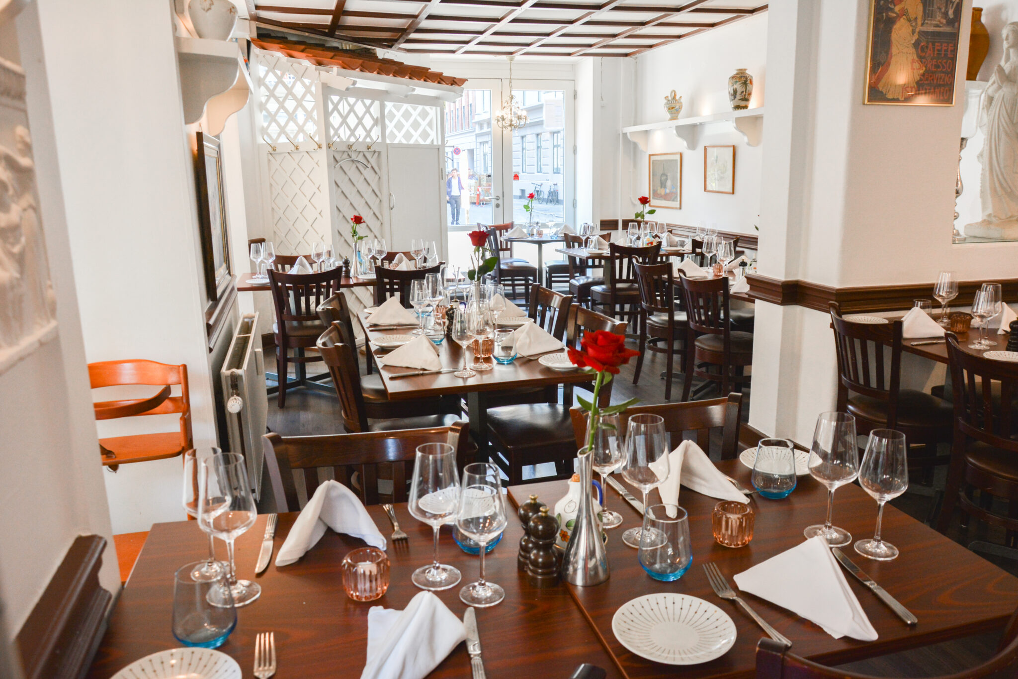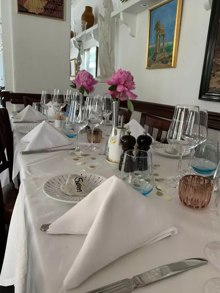 Træd ind i Restaurant Taormina, og du bliver med det samme omfavnet af en stemning, der leder tankerne hen på en hyggelig familierestaurant i hjertet af Sicilien. Her er intet prætentiøst eller overdrevet – kun varme, charme og en ægte kærlighed til italiensk mad og kultur. De hvide vægge med rustikke detaljer, de smukt dækkede borde og de diskrete italienske kunstværker på væggene skaber en afslappet, men elegant atmosfære.